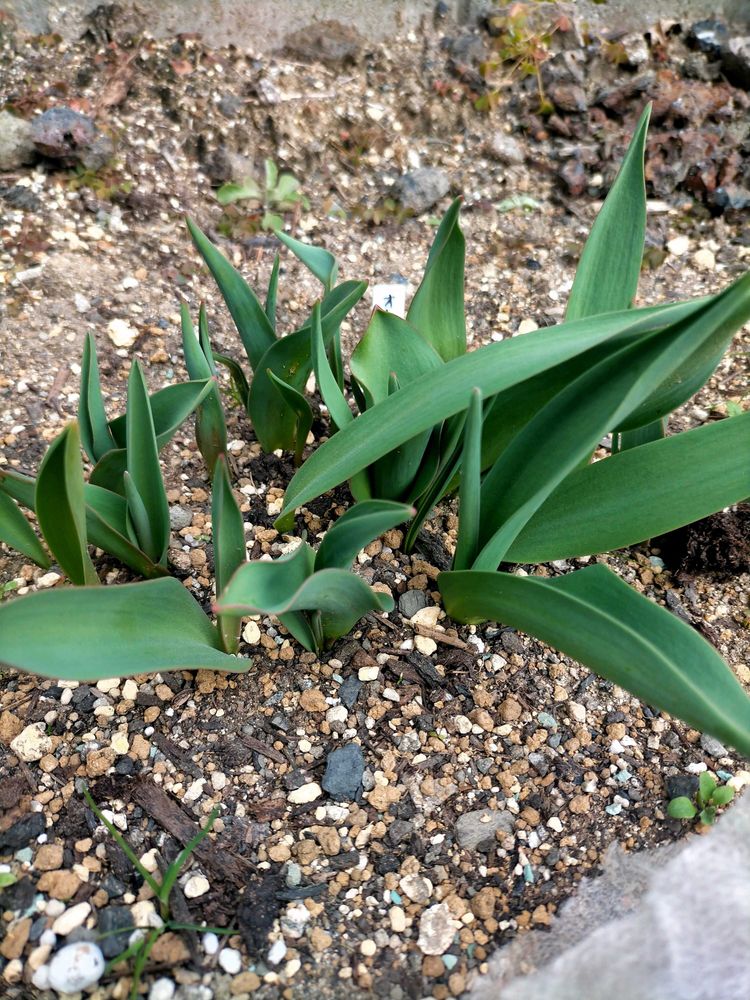 2枚目も同じ冷蔵処理チューリップ。地植えにしたので寒さからかまだ蕾はついていませんが、葉がだいぶ伸びています。