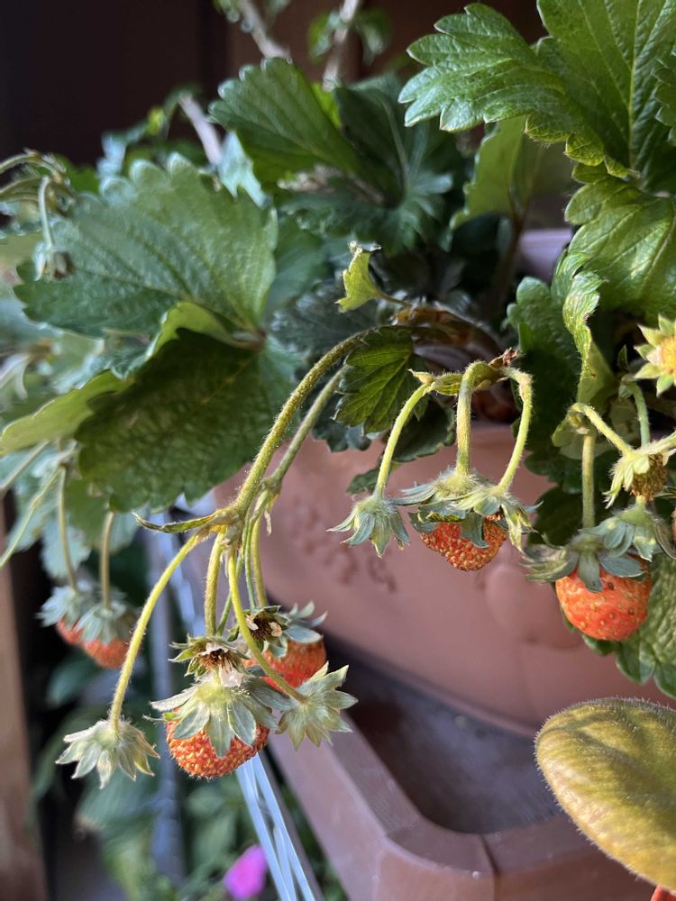 イチゴ🍓昨年のお正月過ぎに買ったんだったかな🤔❓夏越して孫ツルもポットに植えて外で育てています🎶🎶