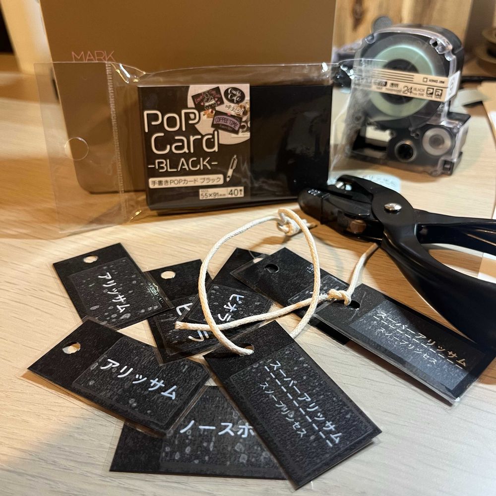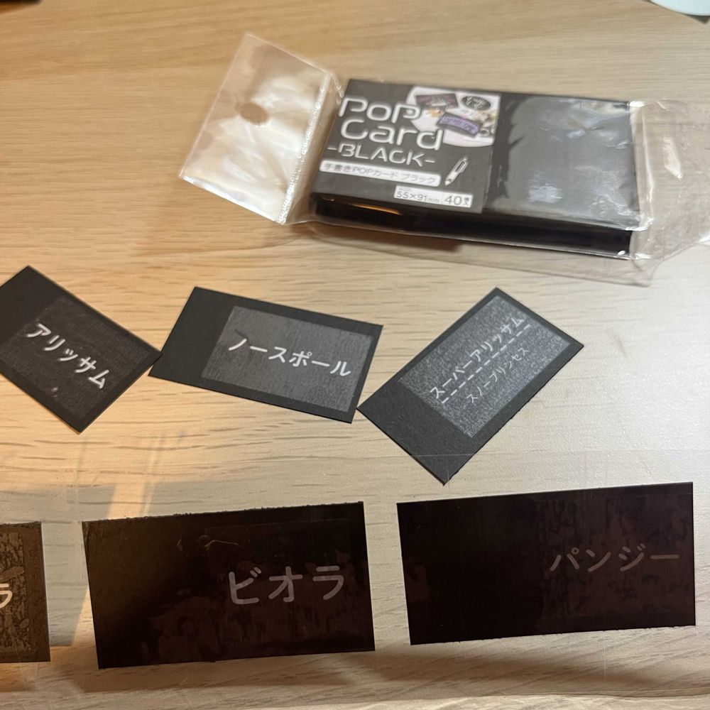 テプラでお花の名前を印刷して、黒の紙に貼ります。