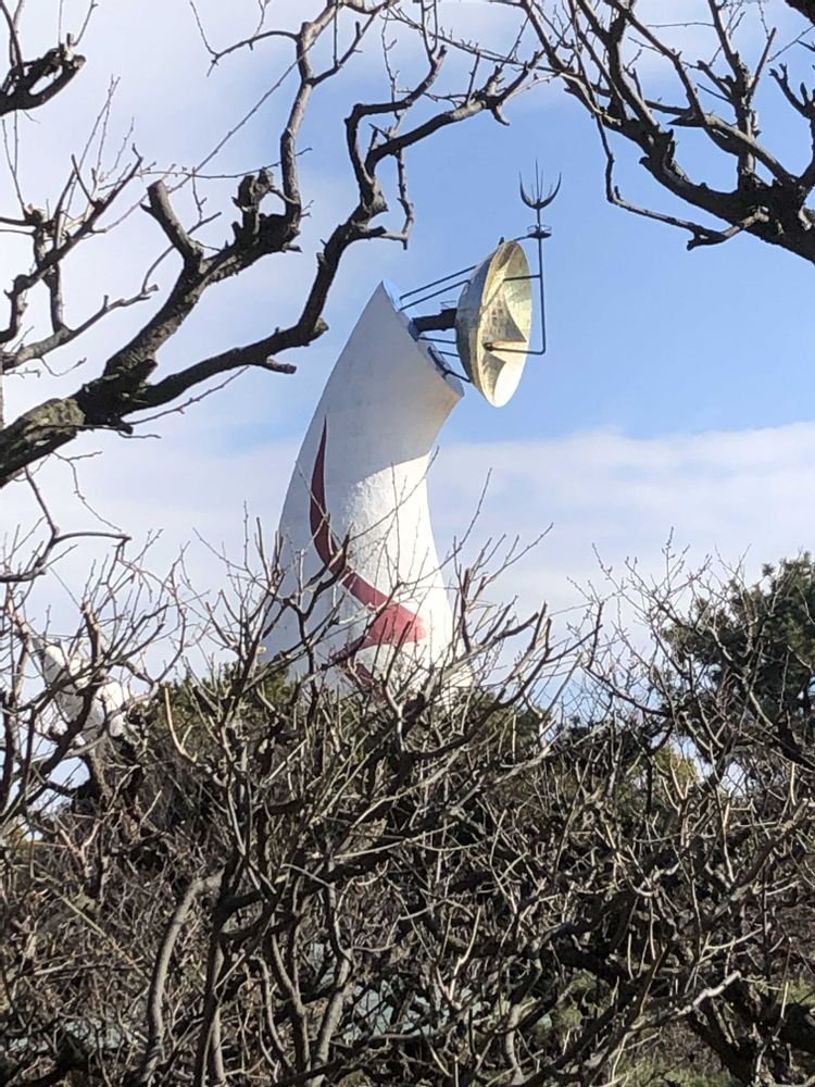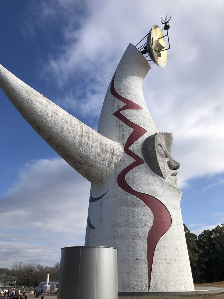 万博公園の梅林から「太陽の塔」が見えます。あっ、ハトさんが「太陽の顔(現代)🌞」にたくさんいます。🐦🕊️😊😄✌️