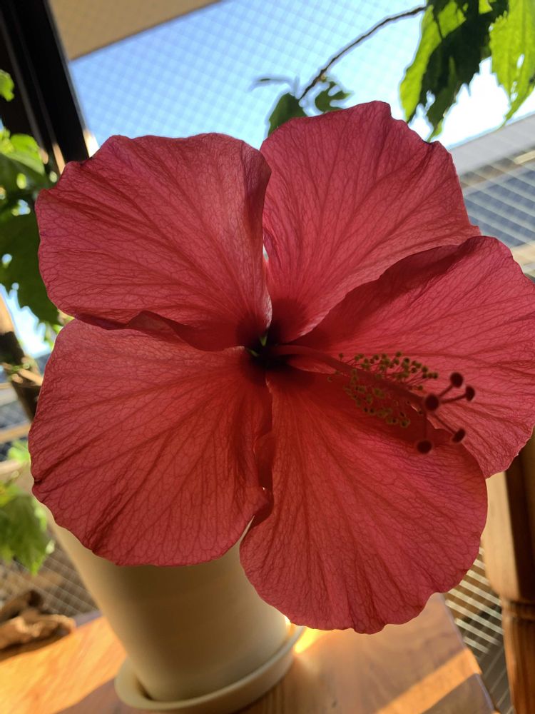 これも昨日仕事がいつもより早く終わって帰ってきてからの陽が透けて朝の赤みの強い色からスケルトンになってる我が家のハイビスカスサマーブリーズ🌺です😊