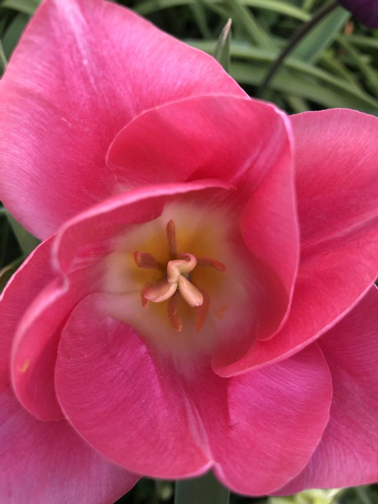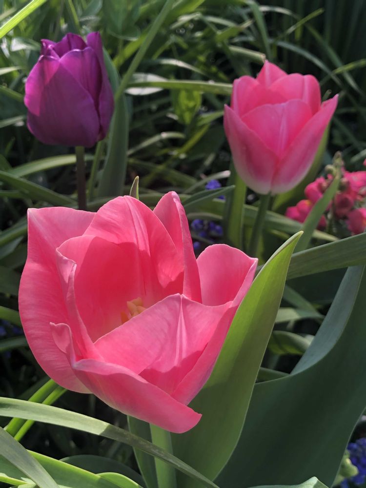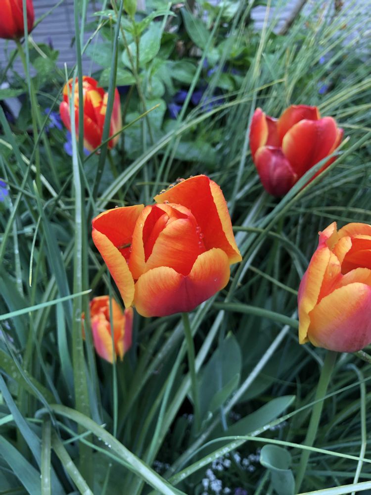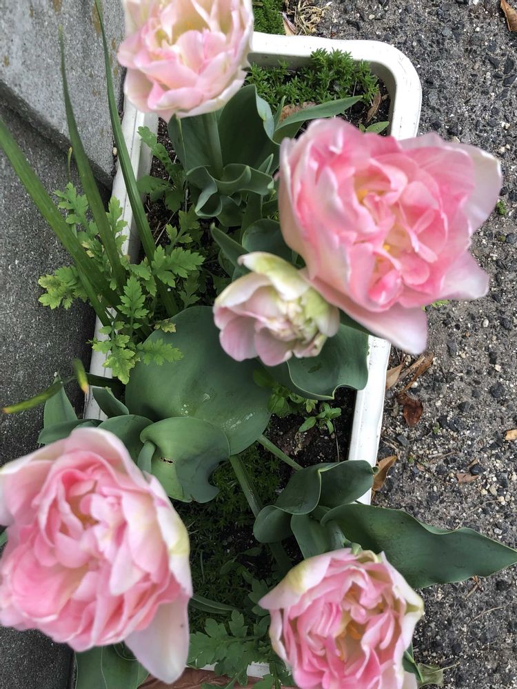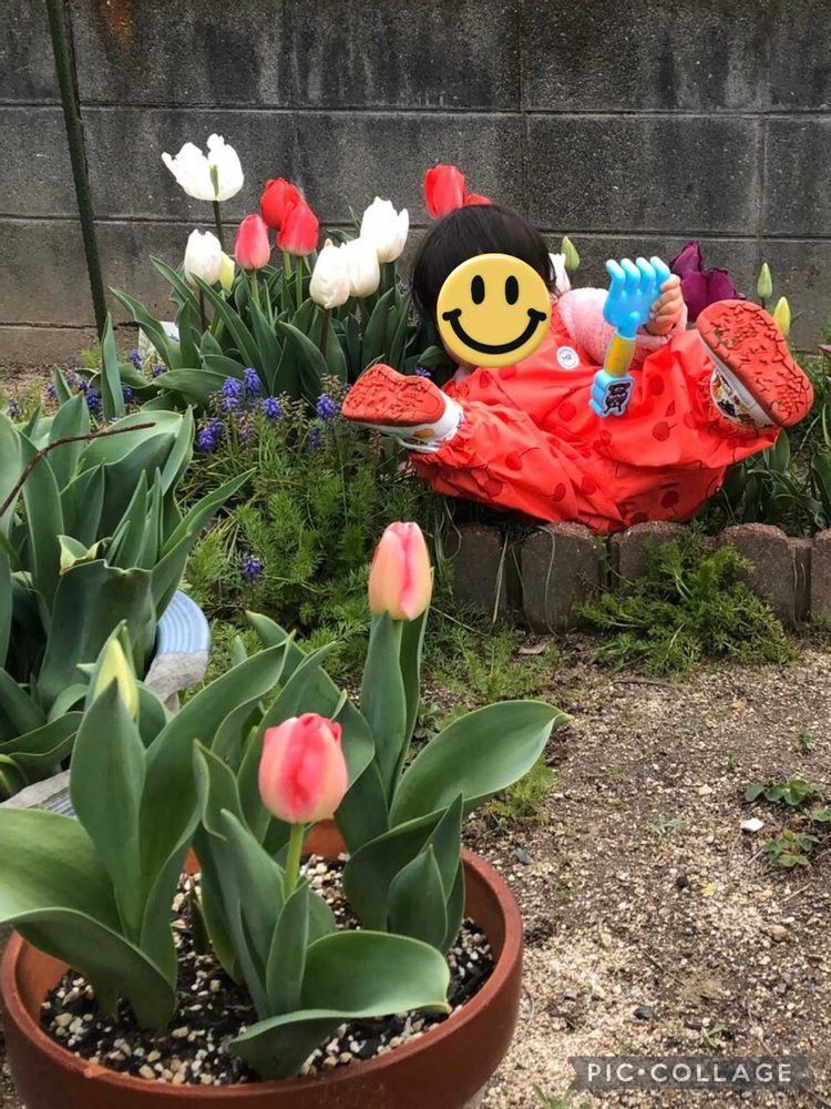 ⑤は、チューリップの花壇に尻もちをついた孫娘。大きな赤いチューリップが咲いたみたいでしょ😍