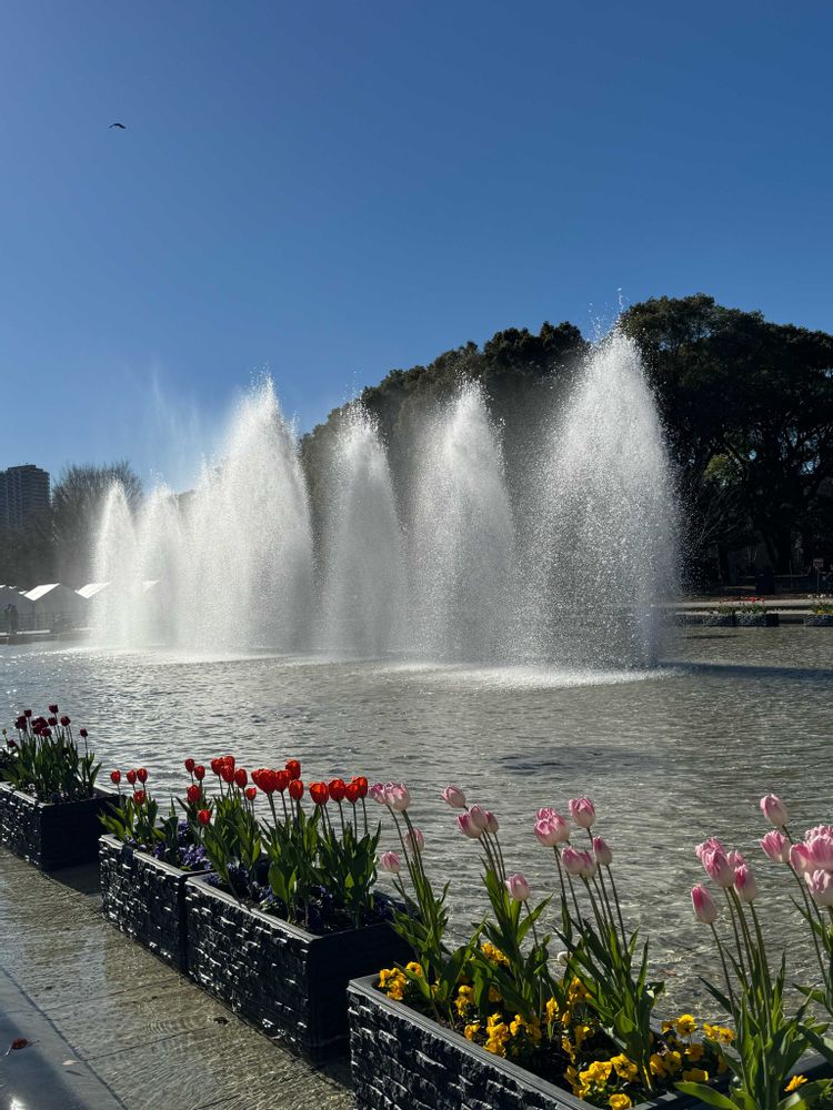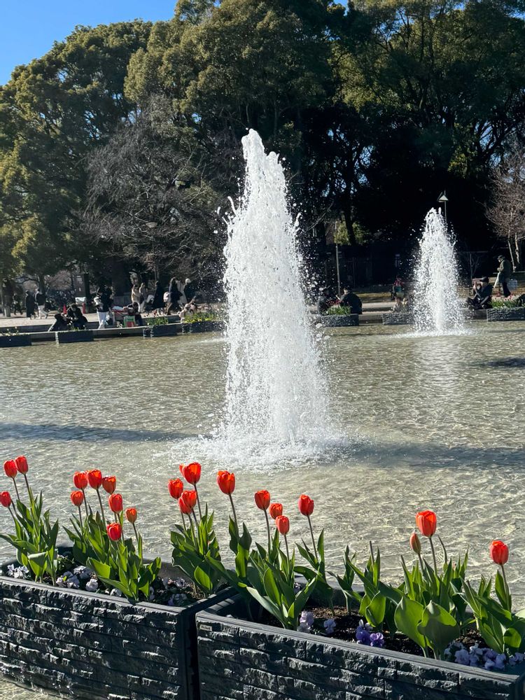 園内の池の周りには色とりどりのチューリップが植えられ,噴水も高くあがり,水飛沫か少々かかりましたが,子供のように楽しみました📱