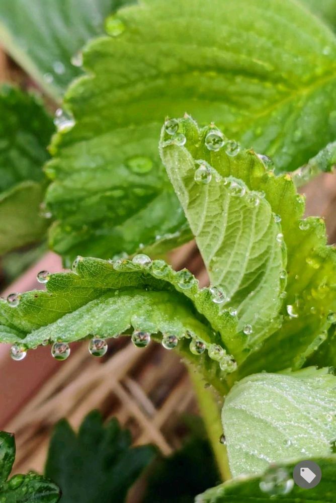 ① いちごの葉に露玉