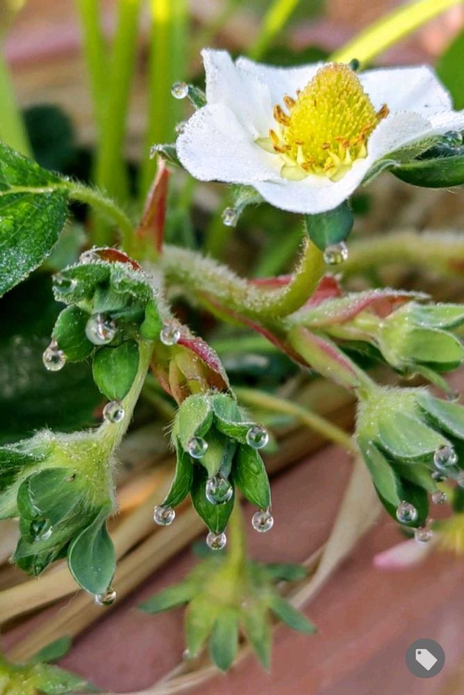 イチゴ🍓の葉の溢液現象はよく見ますが、花が咲いていてヘタの周りに…というのは、ブローチみたいで本当に可愛いです😍