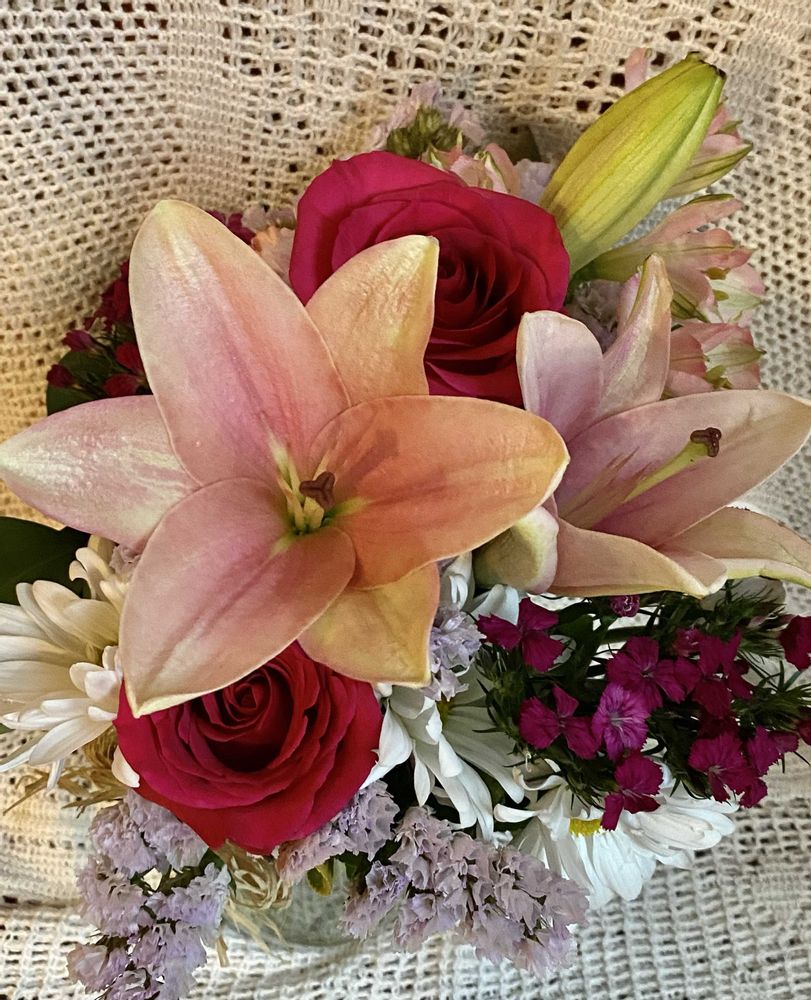 ピンクのユリにバラの入ったブーケを見つけました❣️