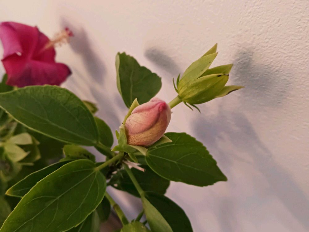 ハイビスカス、今年は剪定せずに玄関に入れたら花咲いてる。