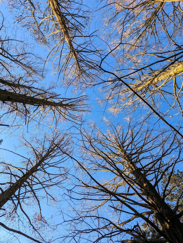 青空にメタセコイアが円陣を組んでいるようでした🌲