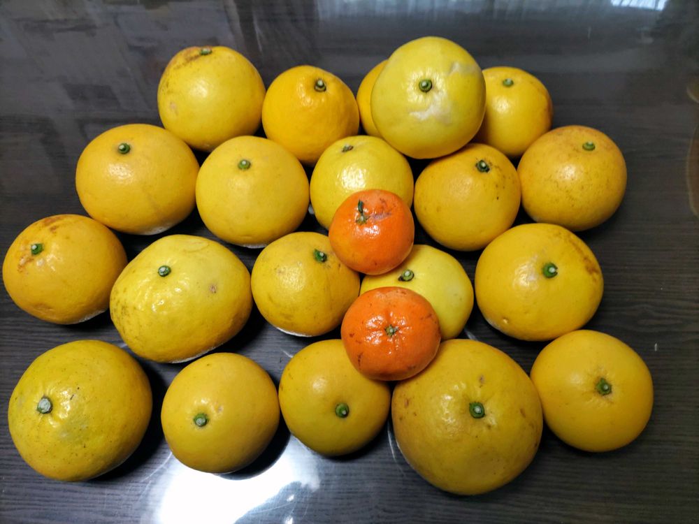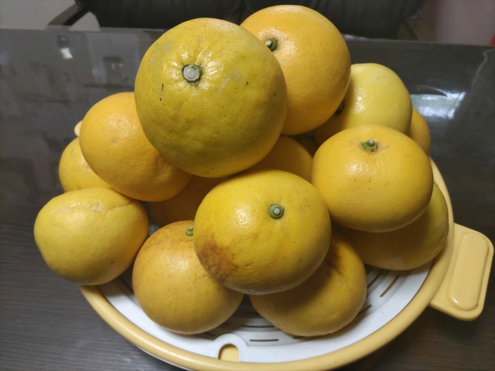 毎年主人の畑の近くで野菜、柑橘類(スイートスプリング、八朔、文旦)作っていてお正月過ぎ食べ頃になり、持って来てくれます。今年はスイートスプリングは、ぜんぜんならず仕舞いだったそうですが、文旦は、みずみずしく甘酸っぱく、美味しかったです🙆😦😋。一緒に召し上がれ·〜😍💓🍊🥰。