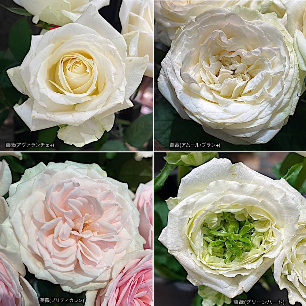 白系x2、ピンク系x1、緑系x1のバラ、4つ。