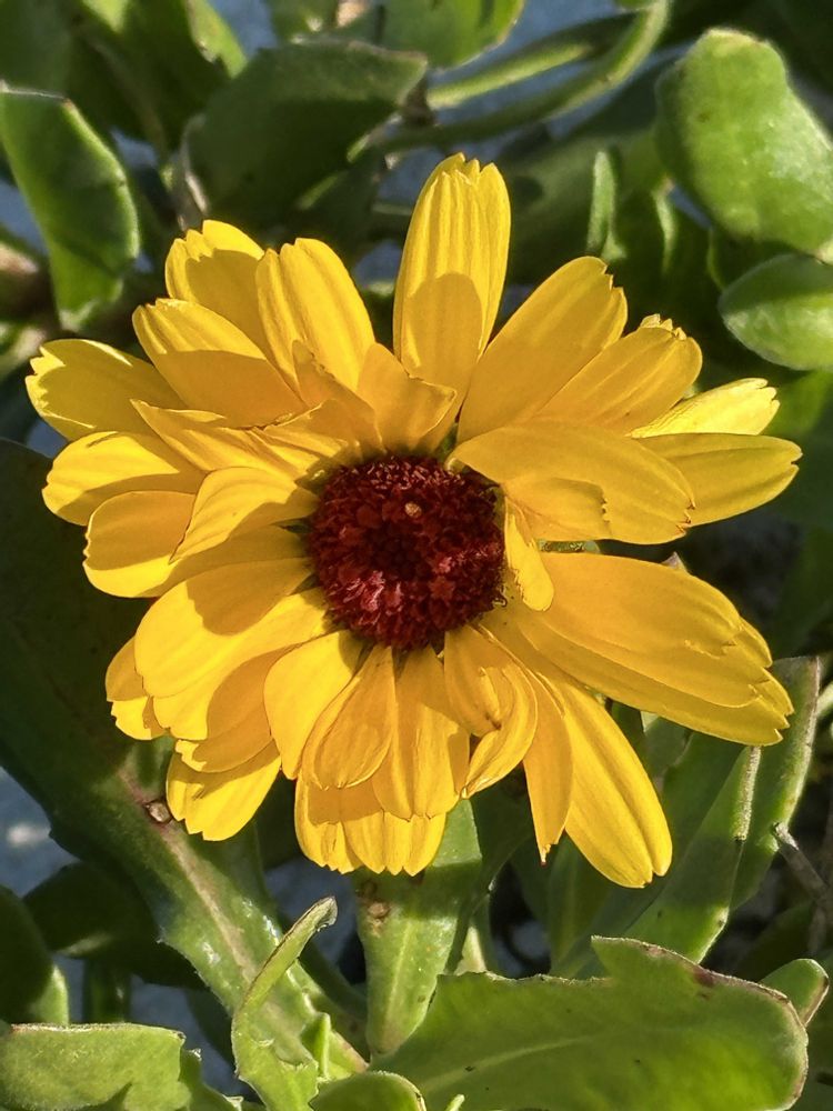 Calendula offieinalis/Calendula. Asteraceae. Asterales. Magnoliopshida. Tracheophyta Commonly called/Pot marigold. Scotch marigold Native to/Southern Europe. Eastern Mediterranean Symbolism/Joy. Hope. Healing *Genus of 20-30 species *Lance-shaped to spoon-shaped,softly hairly leaves, to 6in(15cm)long Flowerheads, to 4in(10cm)actoss *The bright yellow blooms symbolize new beginnings and fresh starts. *St. Hildegard of Bingen documented the first from Germany in 11th century. Photographed 1/16 9:52am 2025 Posted 1/17(Friday) 11:45am 2025