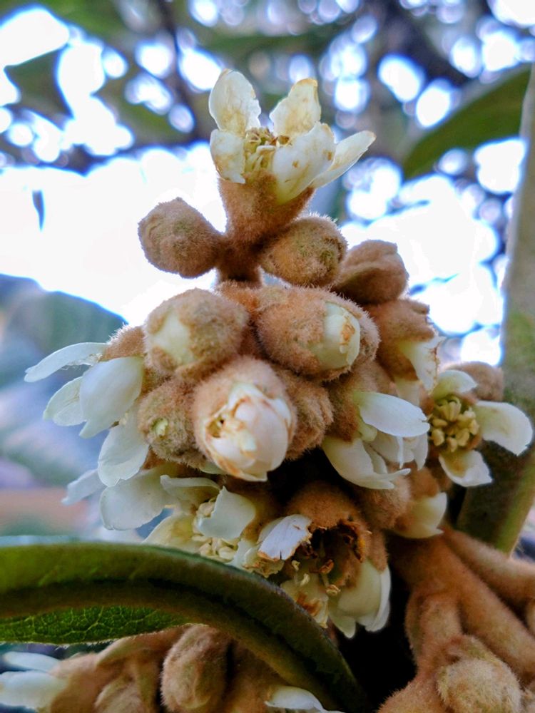 琵琶の花って今さくんだね🎵我が家の琵琶の木は鉢だし種からだから❗