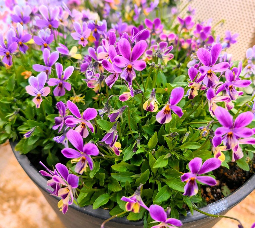 花弁がうさぎの耳のような形のラビットタイプの小輪ビオラ。草姿にこだわって育種されたため、ドーム状に成長します。花付きも画像の通り抜群です✨