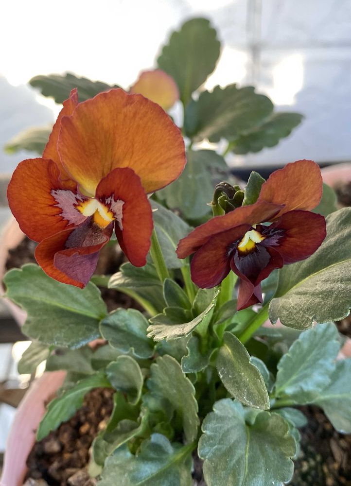 側弁と下弁のブロッチに焼けの入った茶色のビオラです