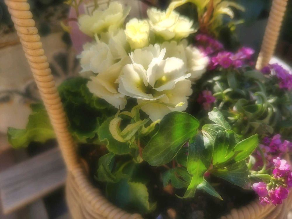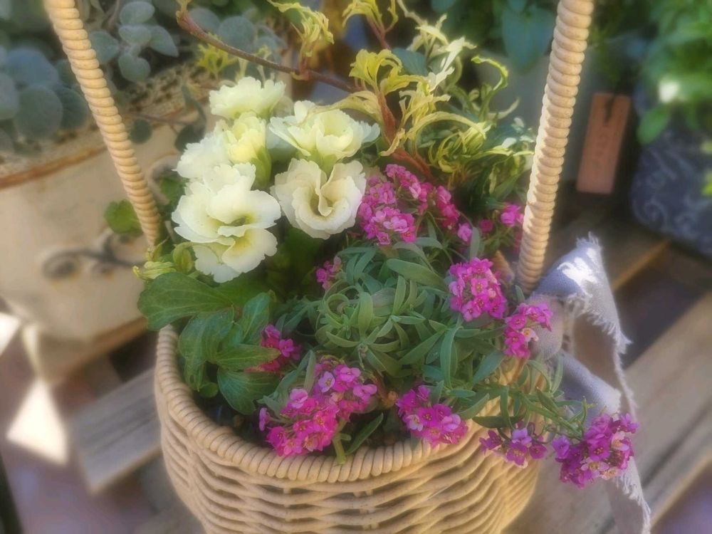 k-plantsさんのプリムラジュリアン・リボンチュチュさんをメインに、お供にアリッサムのシェリピンクさん、リーフ🌿にヘデラの雪の妖精さんを合わせたカゴ🧺寄せ植え😃︎💕︎