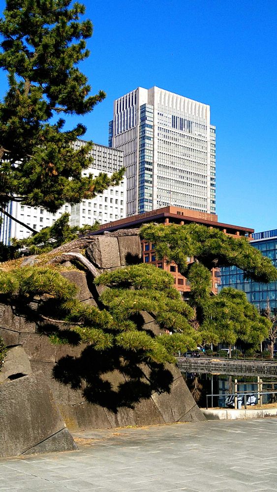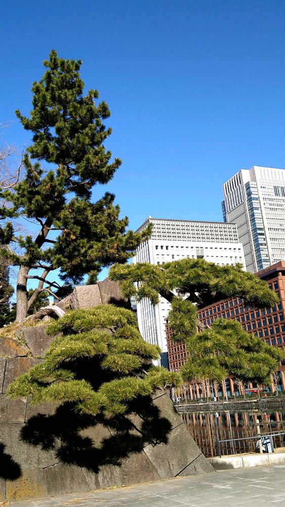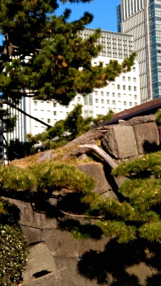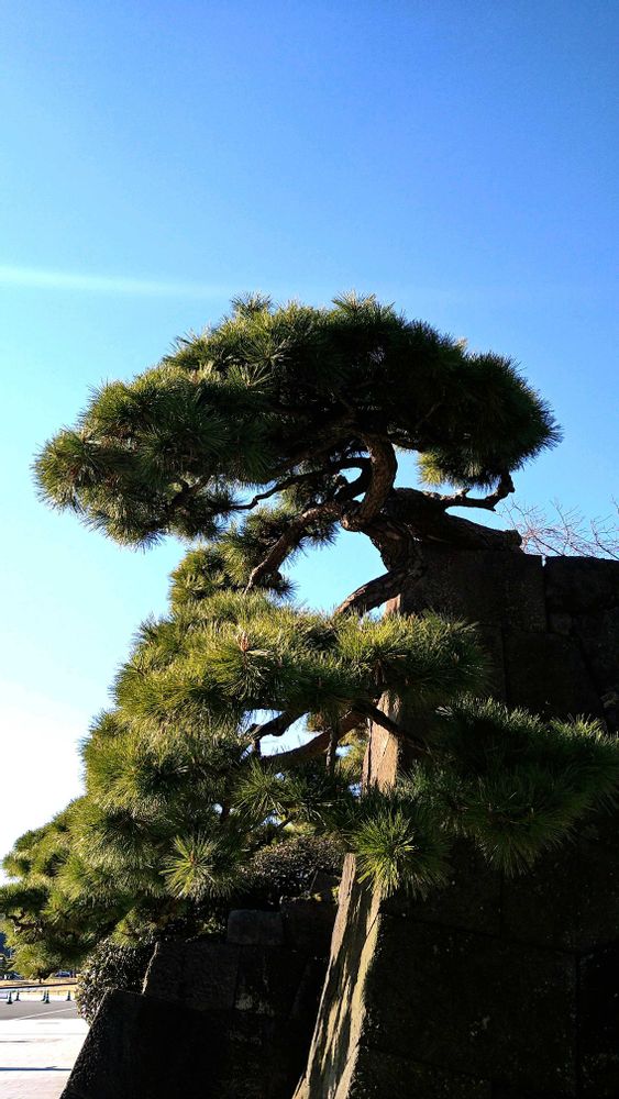 皇居のお濠の石垣の上から伸びた松