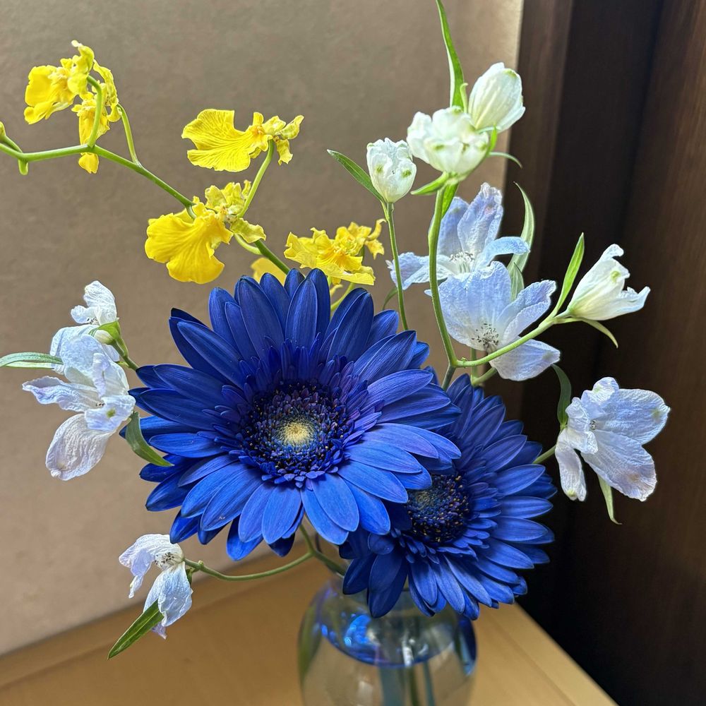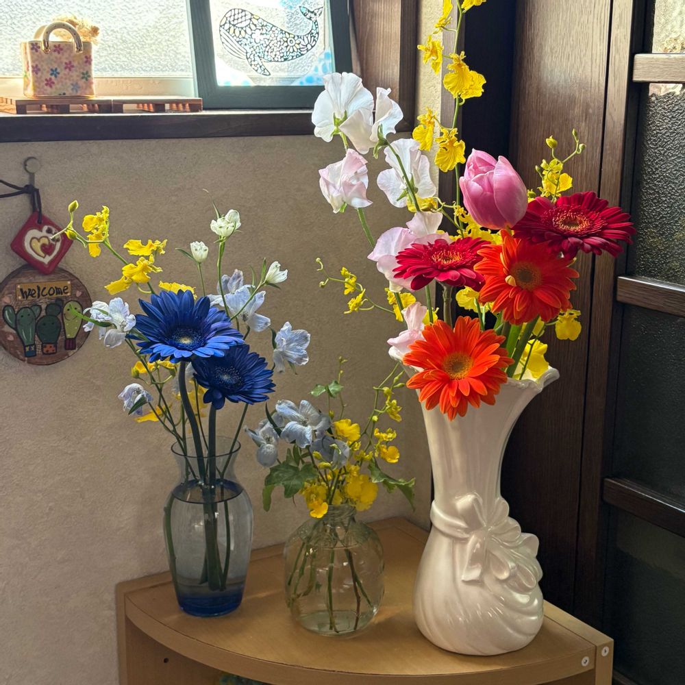 ガーベラ3色、オンシジューム、デルフィニウム、スイトピー、チューリップ🌷