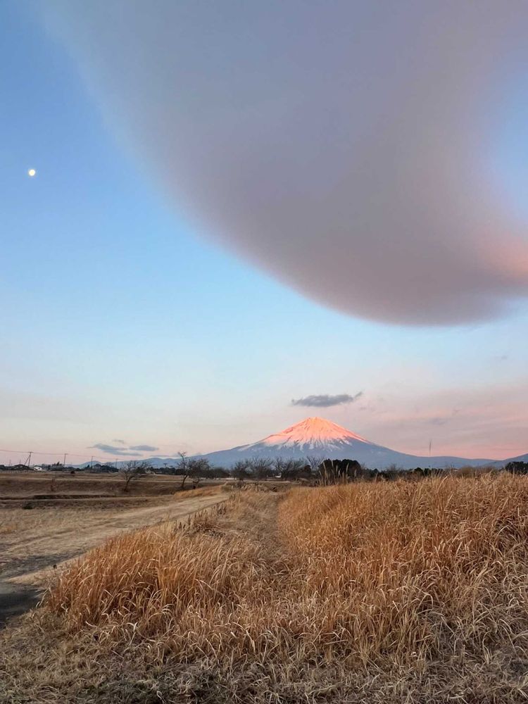 今朝の富士山と吊るし雲、月、冬の葉、雀大群