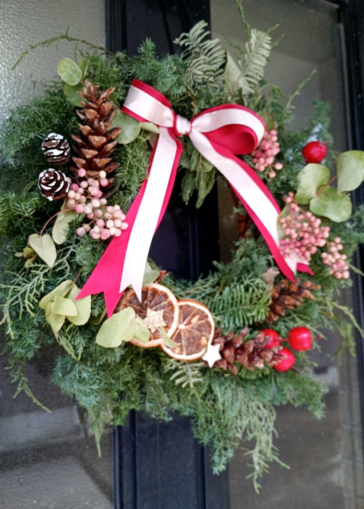 4Pic目、12/10日に公民館で講師を迎えて作ってきたクリスマスリース🎀。クリスマスのロゴ飾りは外しましたが、まだ綺麗な緑💚を保ってくれています😉