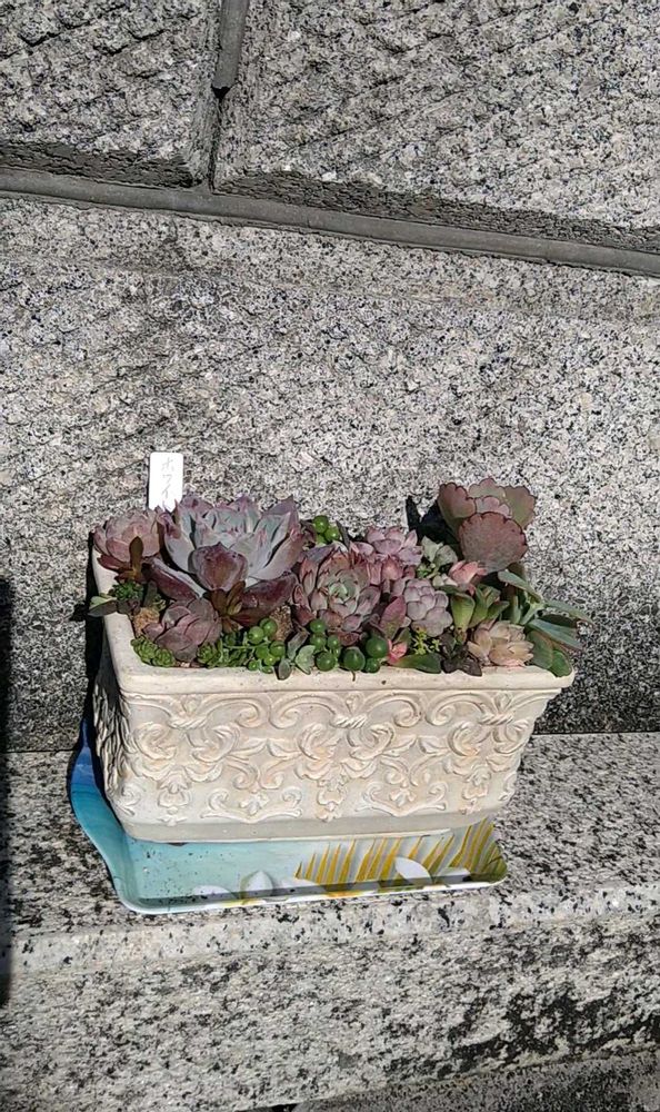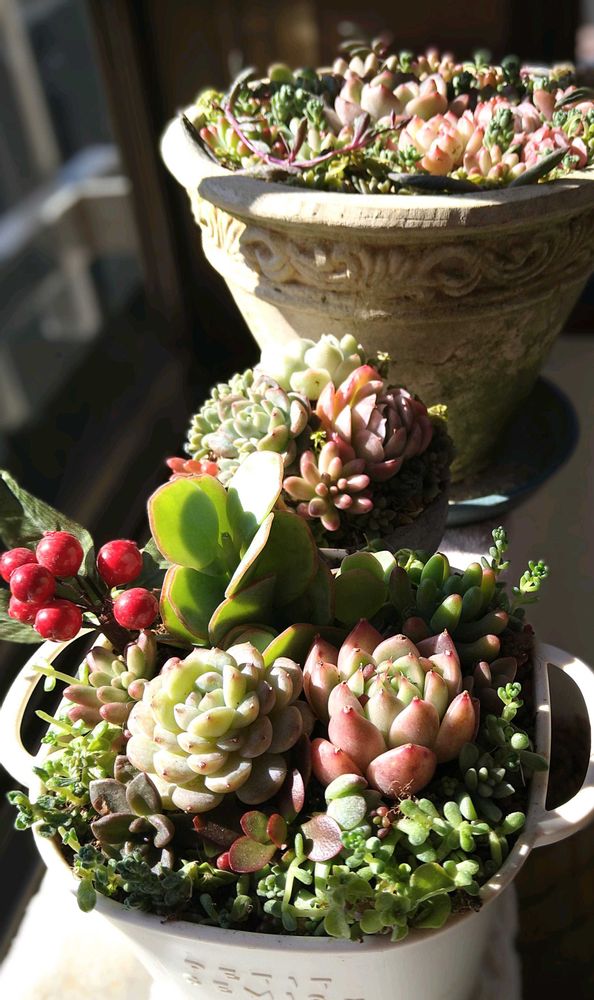 ③👵のゴージャス寄せ植えにセダムを詰めて、ちょいと手直ししたらいい感じになったよ。