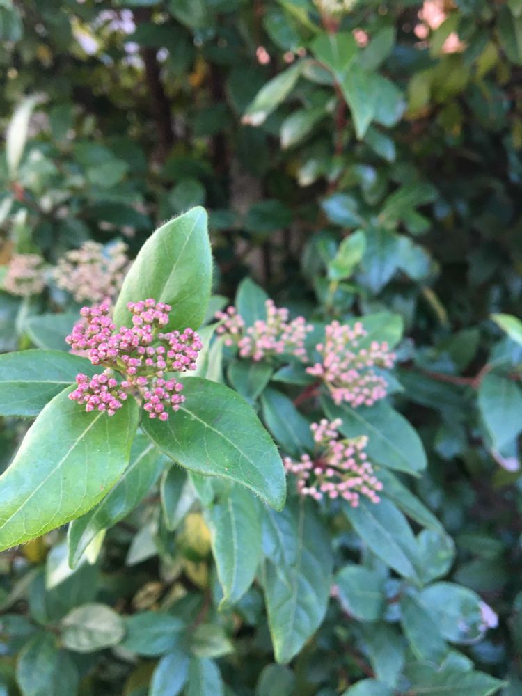①ビバーナムティヌス 蕾が色付いてきた。水やりしなくても、どんどん大きくなる木。実がなかなか付かないのはなぜ?