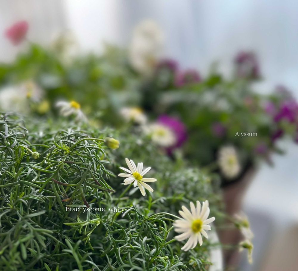 冷たい空気で小さくなっていた、ブラキカムの鉢植えやブラキカム、ビオラ、デージーの小さな寄せ植えも元気になり始めました🪴