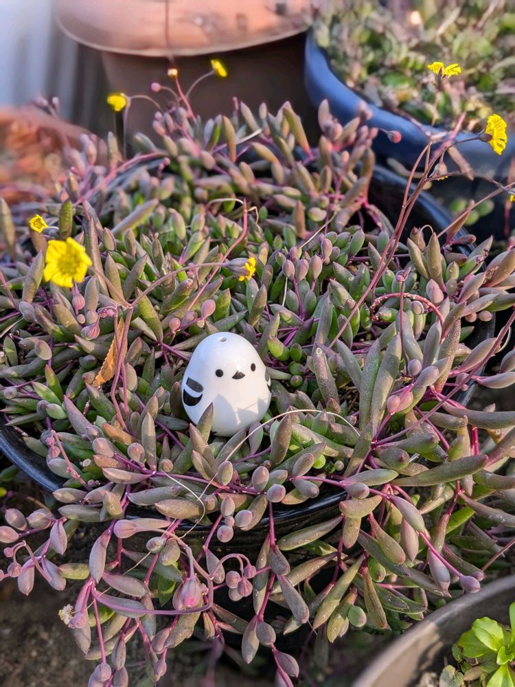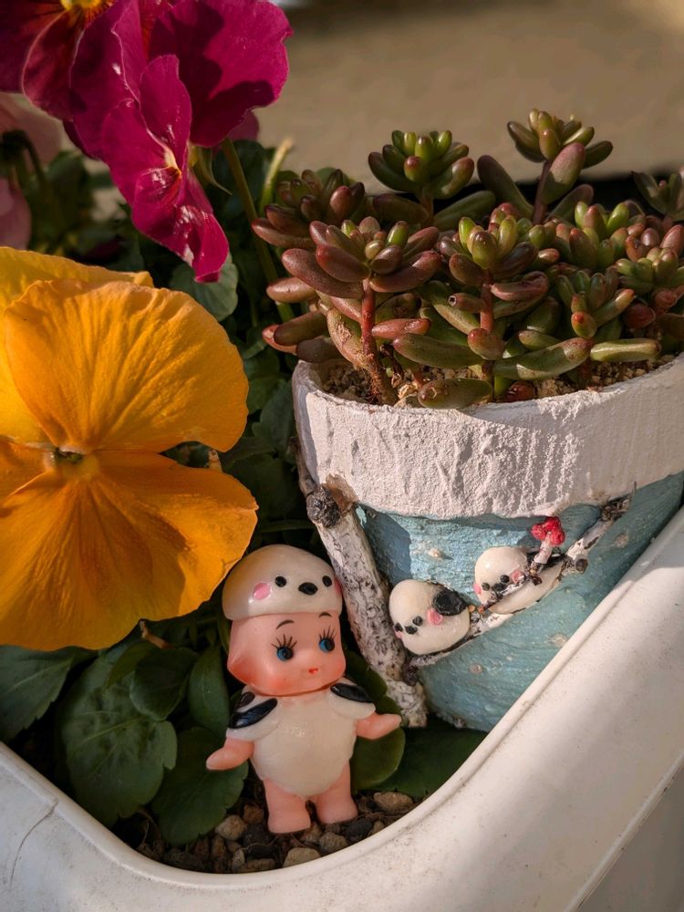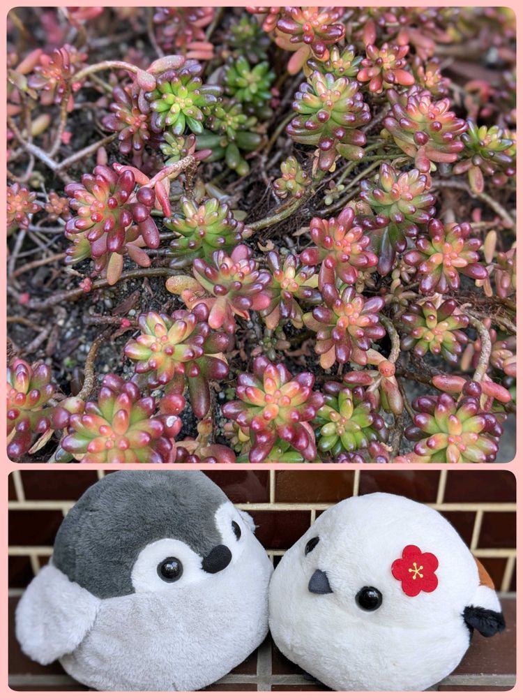 ①どちらも、いちごみるくさん作のリメ鉢💕とシマエナガキュピちゃん💕❣️ぽかぽか陽気の中、楽しくおしゃべりしているみたい💕🥰💕