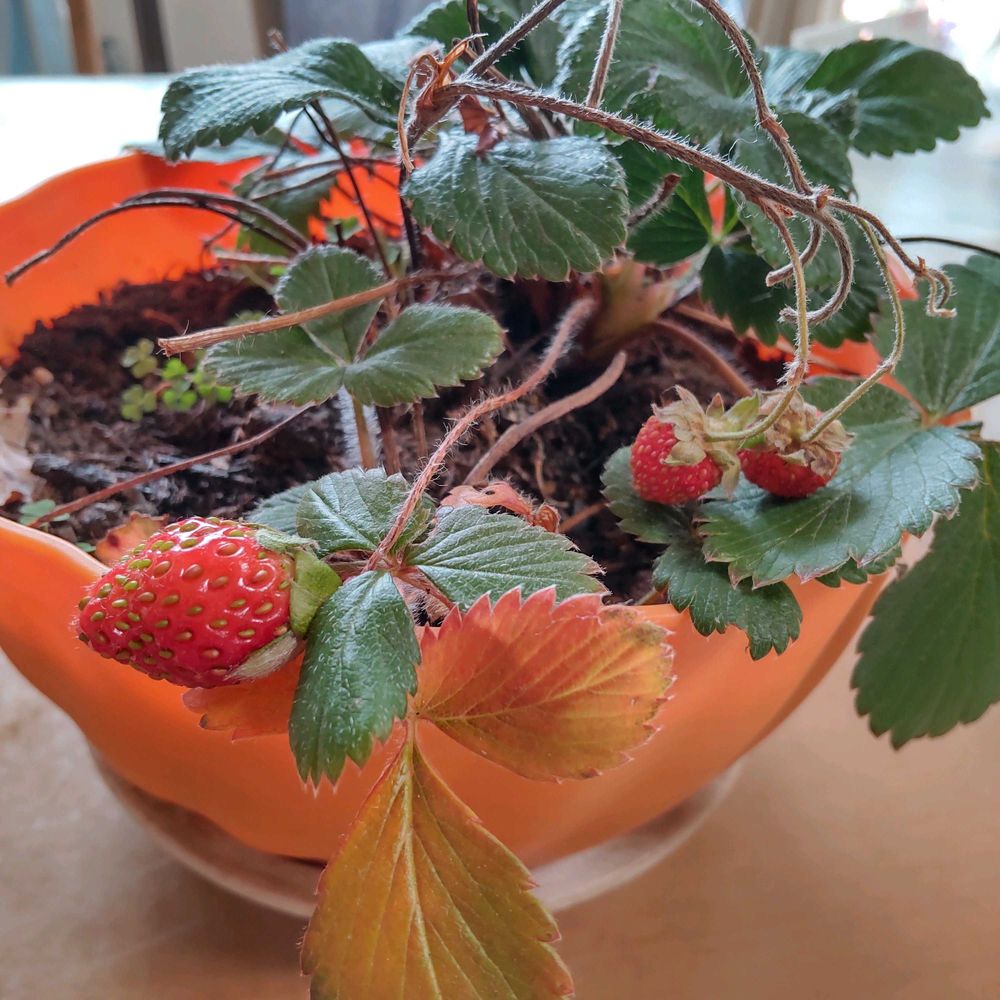 今朝の朝採りイチゴです。外の暖房機器の2台の室外機の間に置いてました。昼は、光が入り夜中寒さからふせげます。昨年の冬から4個くらいは出来ました。冬イチゴと言う季語もありますね。