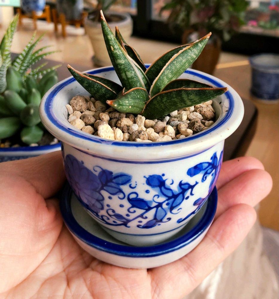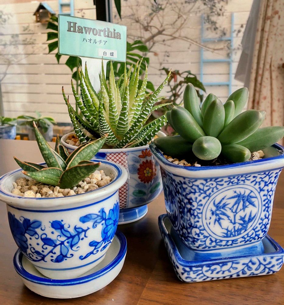 ホームセンターで見つけた右のムチムチの多肉、植木鉢と合ってるでしょ。2枚目のサンスベリアの手のひらミニ感が良い。3枚目中心が白い。4枚目ハオルチアは植え替えの時に真っ白の子株を発見した。土に埋まってる。
