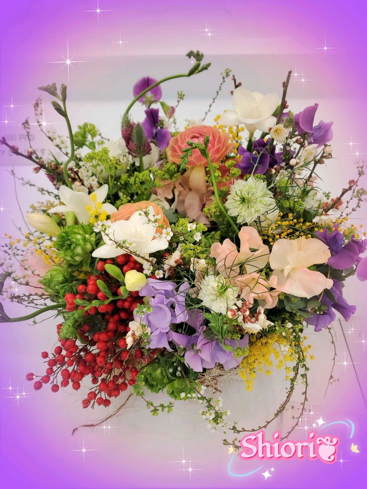 スイートピー🩷💜を使ったフラワーアレンジメント*❀٭とお散歩ちゃんで~す😆👏✨🎶