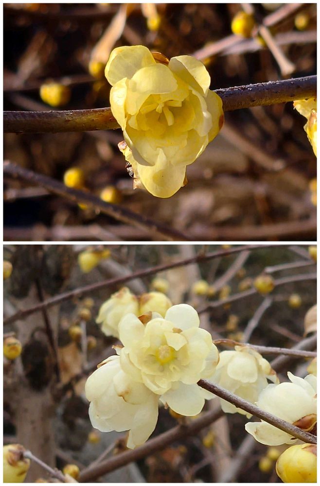ロウバイ(上)とソシンロウバイ(下)を撮ってきました📸 ロウバイのほうが色が濃いように見えますね。ソシンロウバイはロウバイから生まれた品種とのことです📖