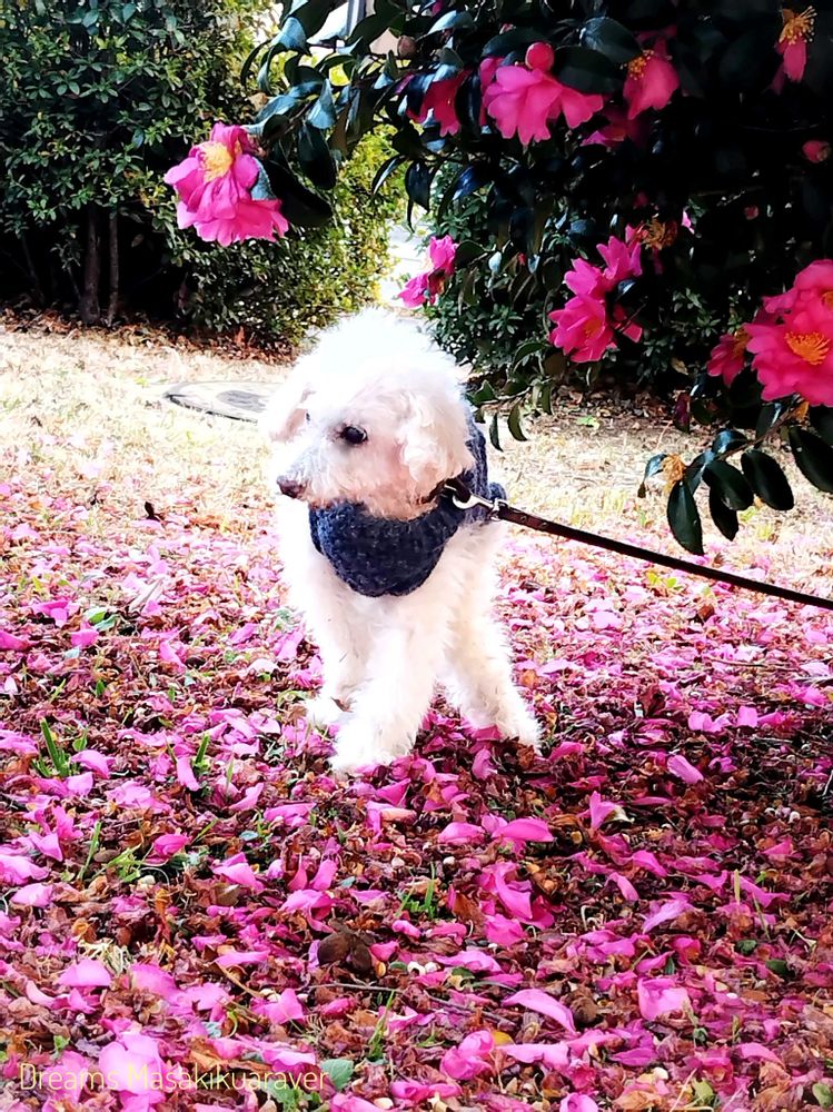 山茶花の花弁の絨毯にワンちゃん🐶可愛い素敵なpic🩷🐶😍💕