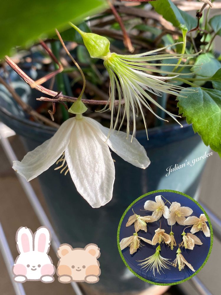 ①度々登場しています😅うちのクレマチス シルホサ ジングルベルの白いお花がそろそろ終盤に入ってきて 花弁が落ちた所がイカちゃんみたいで可愛くて🤳