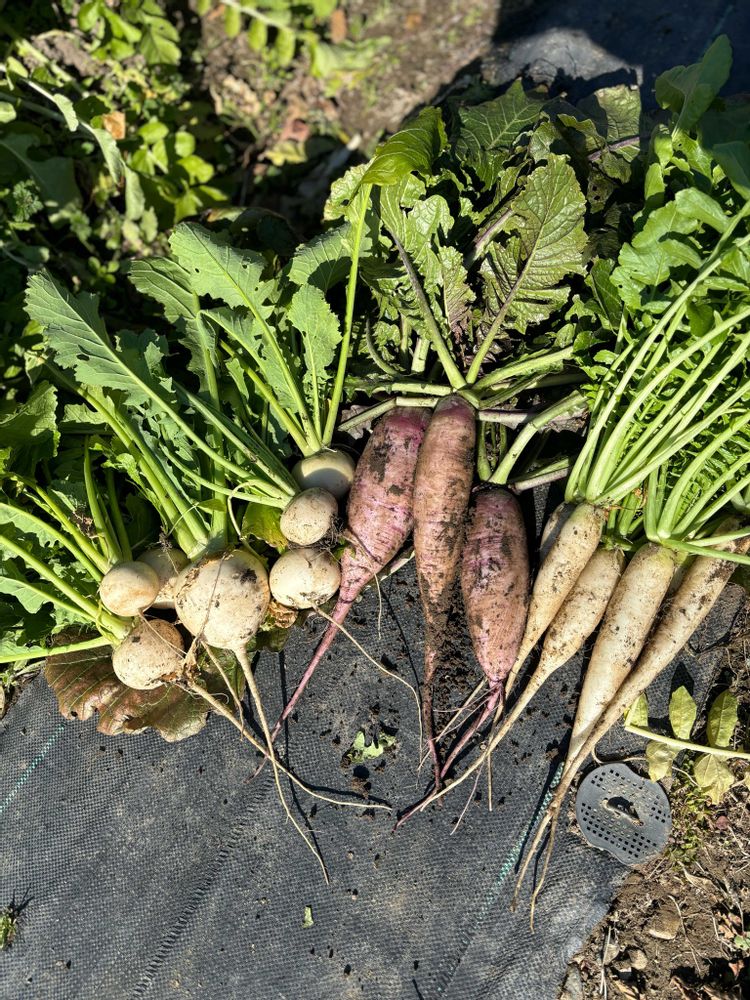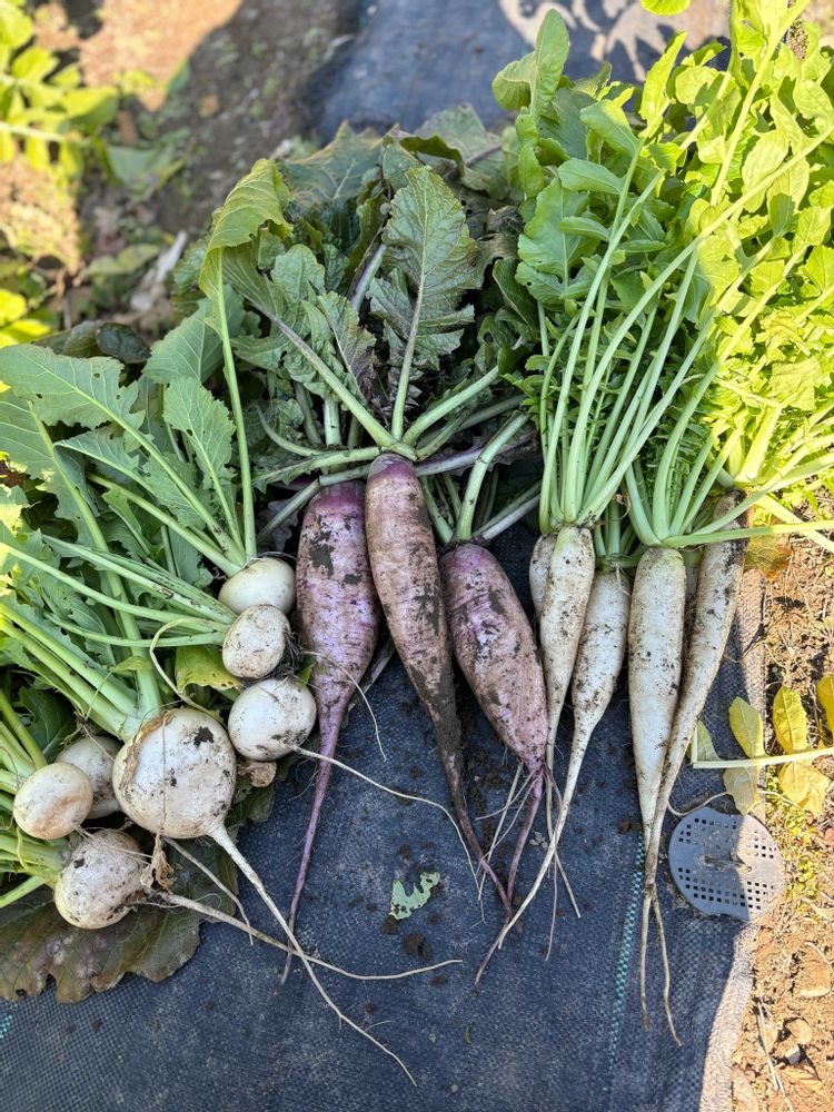 おはようございます(*´ `*)♥金町小蕪✨️と宮重大根✨️赤大根✨️を収穫しました꒰(⑉• ω•⑉)꒱⤴️ 宮重大根は、まだまだかな〜😊 娘が大根サラダ食べたい🤤って言ってたので宮重大根はサラダ🥗 ͛.*にしまーす(≧∇≦)♡⃛