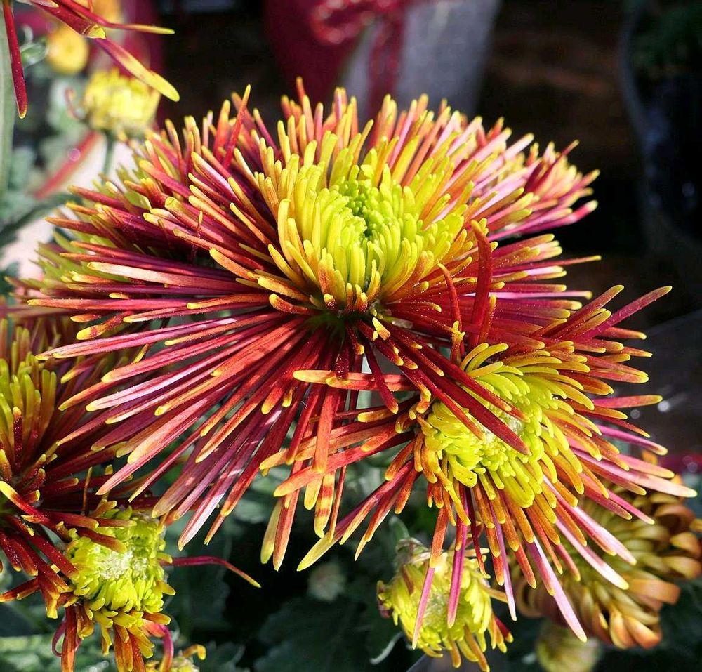 ディスバッドマムの中でもスパイダー咲きと呼ばれる咲き方をしており、糸のような花びらが放射状に広がり、開花するとまるで花火のようにふんわりと広がる。