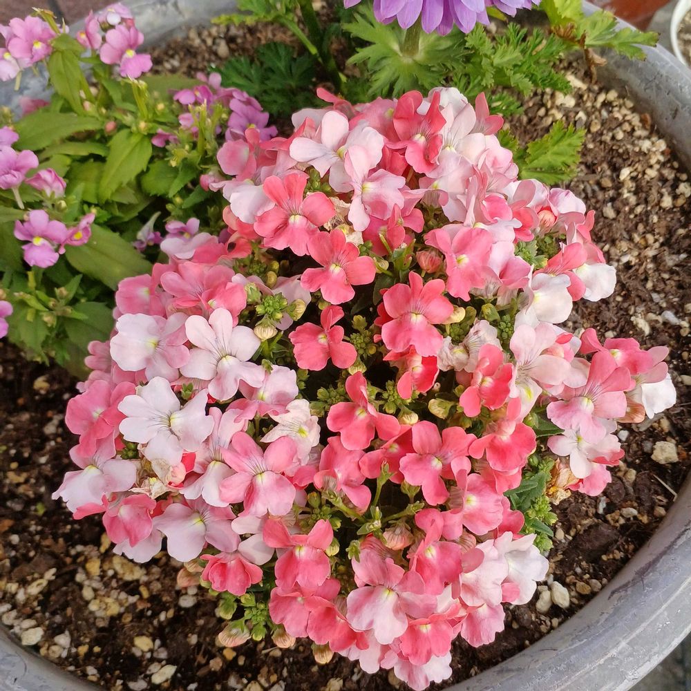 比較してみようと思い、ピンクを切り戻し、紫をそのままにしたんですよ。見えるかな、左奥の紫のネメシア、開花状態が全然違ってびっくり👀