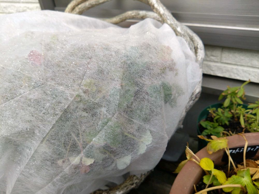 ヘデラと寄植えしたまま、不織布かけて軒下にいます🏠️②
