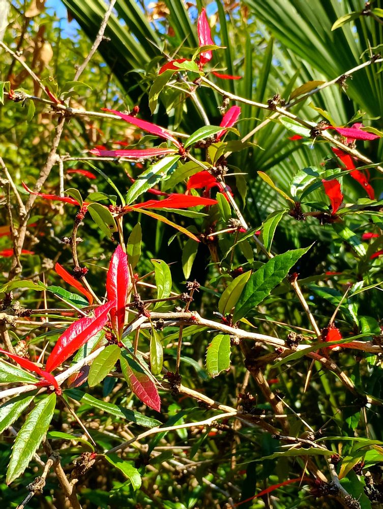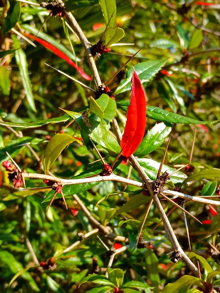 おはようございます😃 全部が紅葉するんじゃなくてポツッて赤い葉が見えるのが良いですね♪ 長〜い棘の根元の塊は実ですか? あんな鋭い棘があると鳥も動物も種を運んでくれませんよね!どう言う生き残り戦略でしょう?🤔