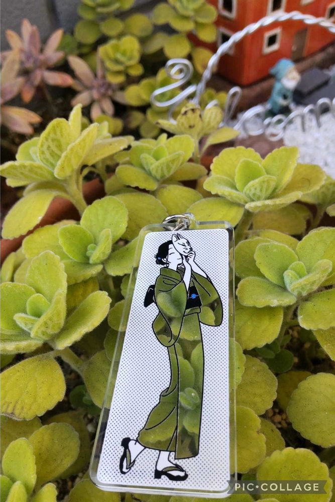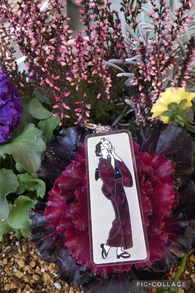 2枚目は、お散歩ちゃんキーホルダー(あやめちゃん)と、今も外で頑張っている、素焼き鉢のアロマティカスと一緒に💕