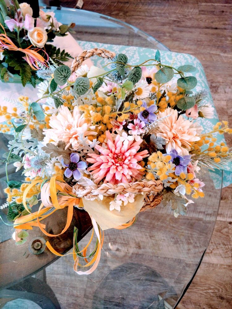 今月のお稽古のお花、アーティシャルフラワーのアレンジメントです、ガーベラ、ミモザ、ノースポール、ブバリア、エリンジューム、ハートカズラ等、春らしいお花でまとめました、待合室へ〜😊💞💞