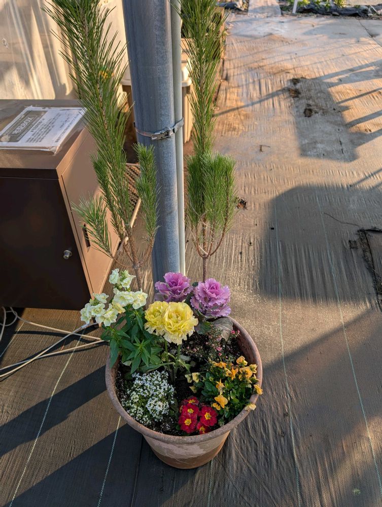 マツやハボタンなどお正月らしい感じの鉢植えです。