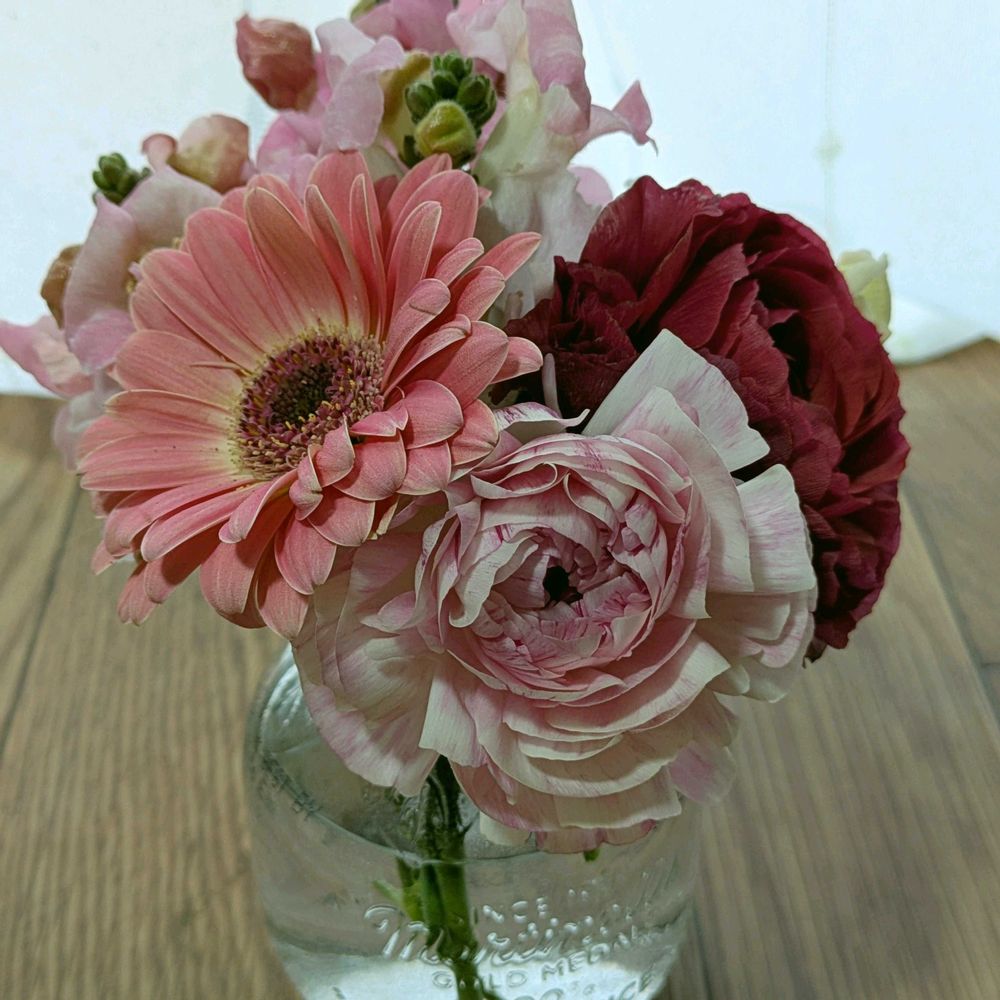 咲いているラナンキュラス、ガーベラ、金魚草をチョキチョキ✂して切り花にしました💐