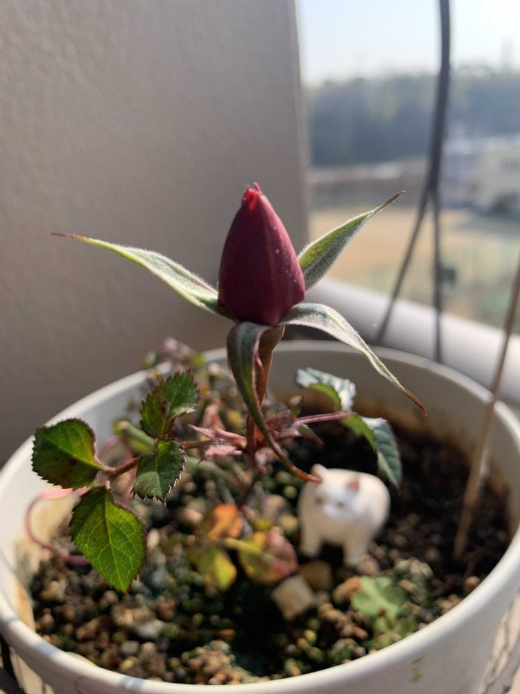 ①我が家のミニ薔薇、この時期はこれが最後かなーと思う真っ赤なミニ薔薇の蕾🌹