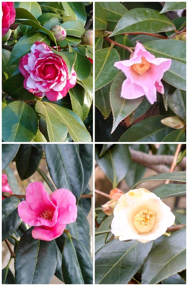 いろいろ仲よく咲いています😀 「ツバキ」というと、個人的には少し古風で地味な印象をもってしまいますが、いやいや、オシャレな花が多いですね🥳(農業試験場内にて)