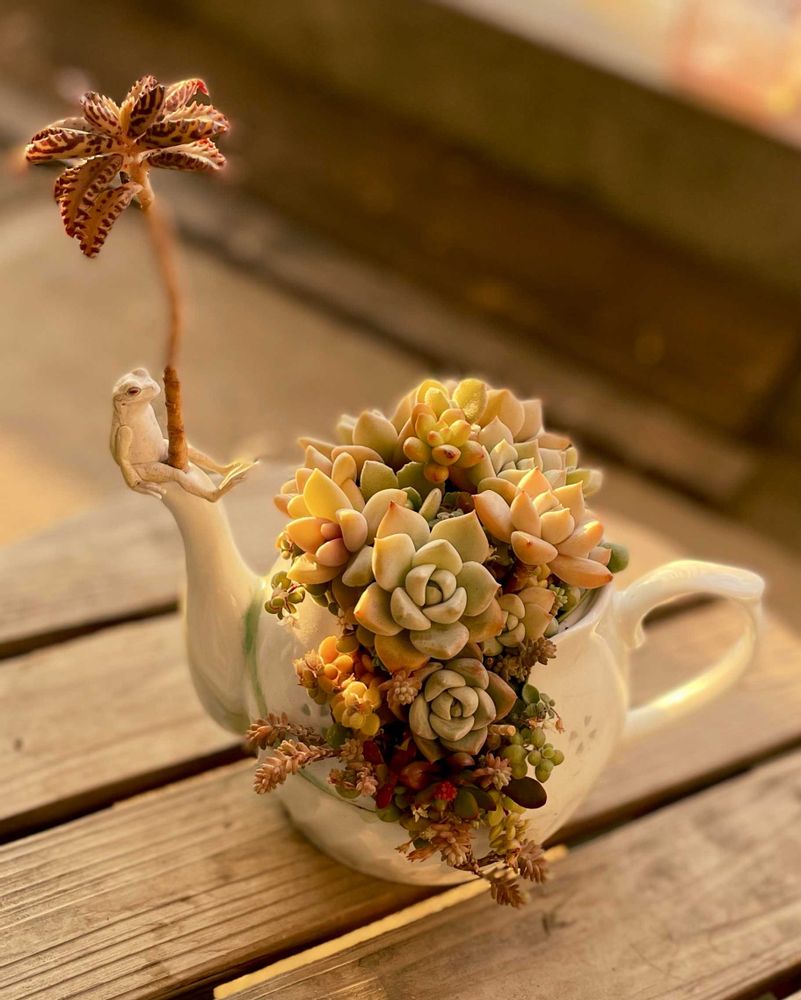 最初からそこに居るってほど急須とマッチしていますね( ˶´⚰︎`˵ )素敵な寄せ植えです🫶