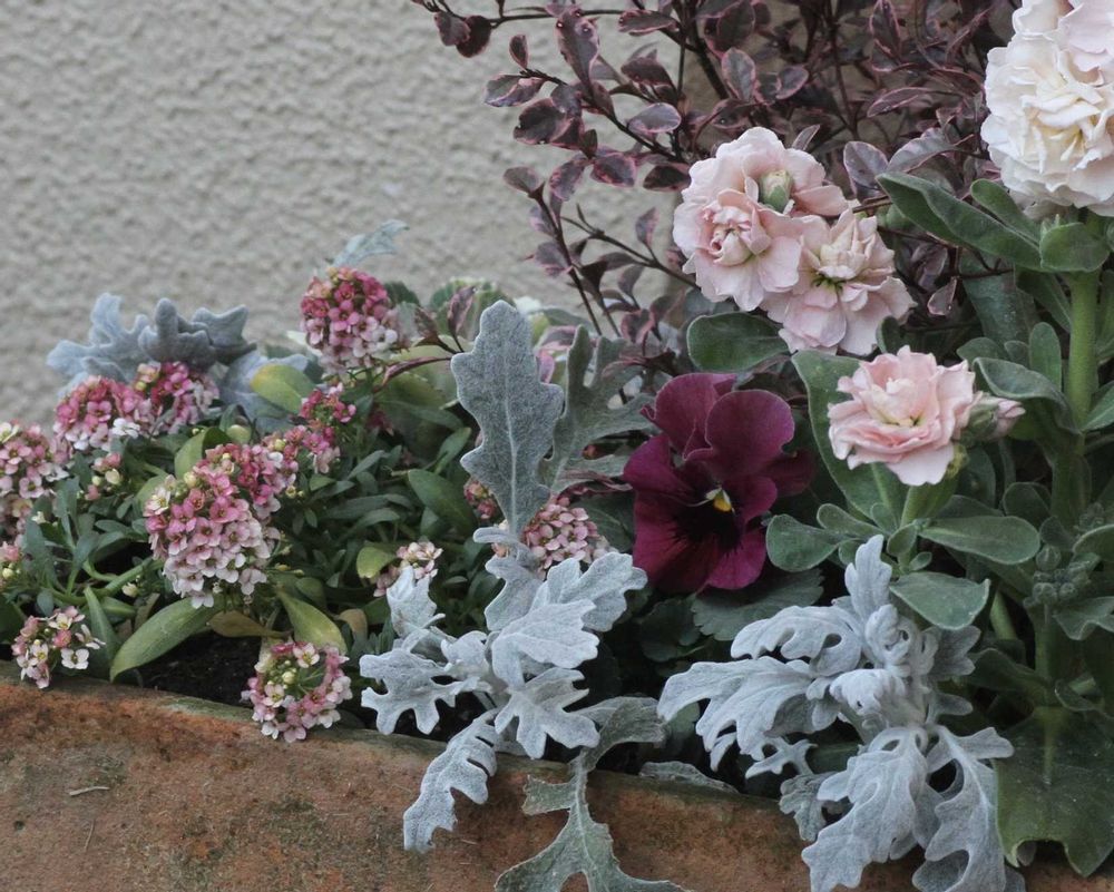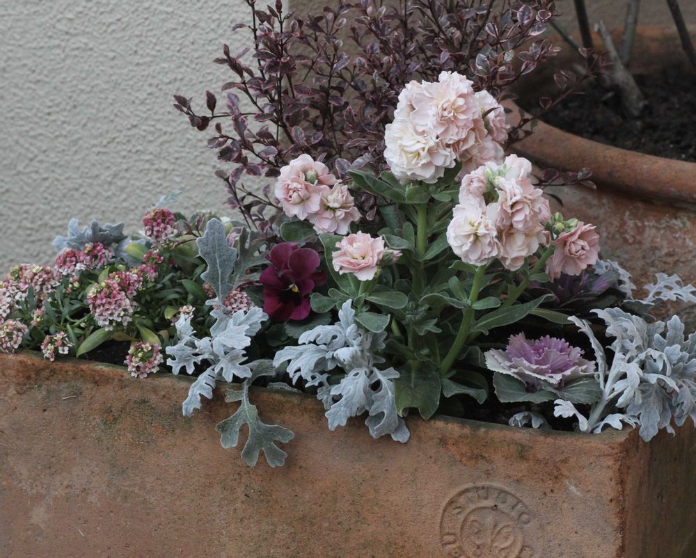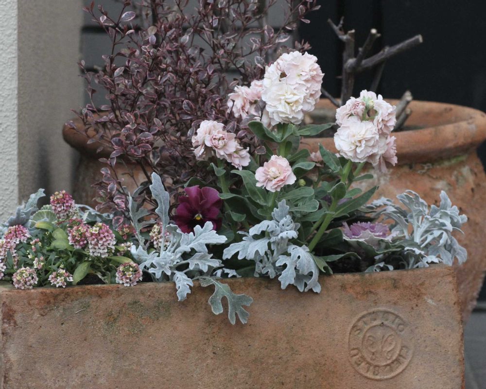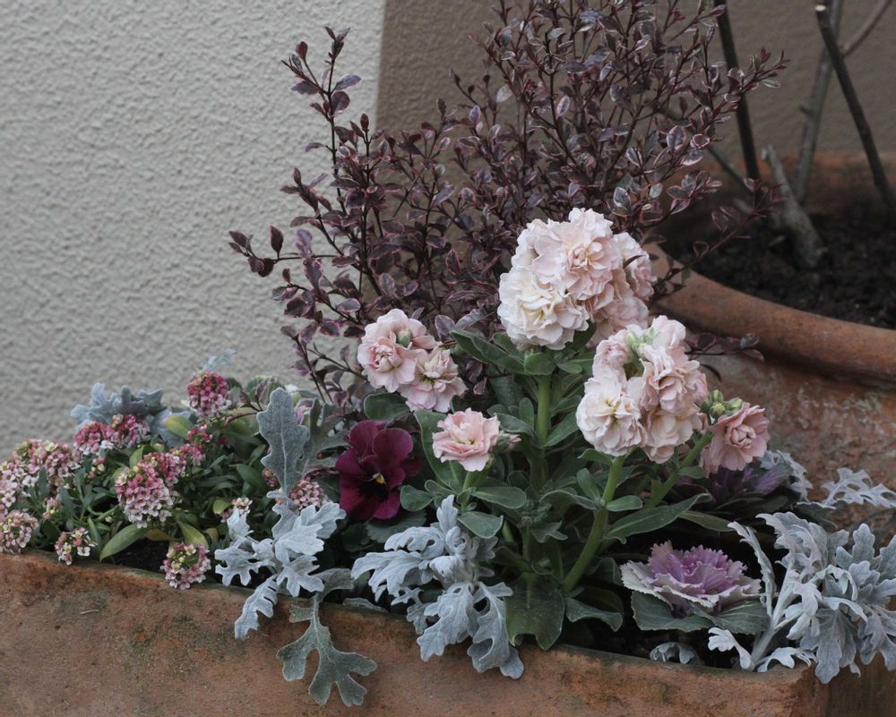 お店でロフォミルタスとストックとアリッサムの色味に惹かれ寄植えに、、、