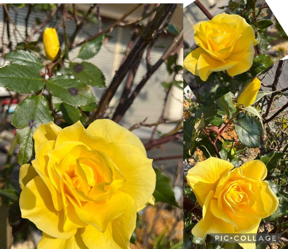 暖かい日差しの中、ご近所の黄色いバラがキレイに咲いていました。春の黄色い花は気分が上がりますね。