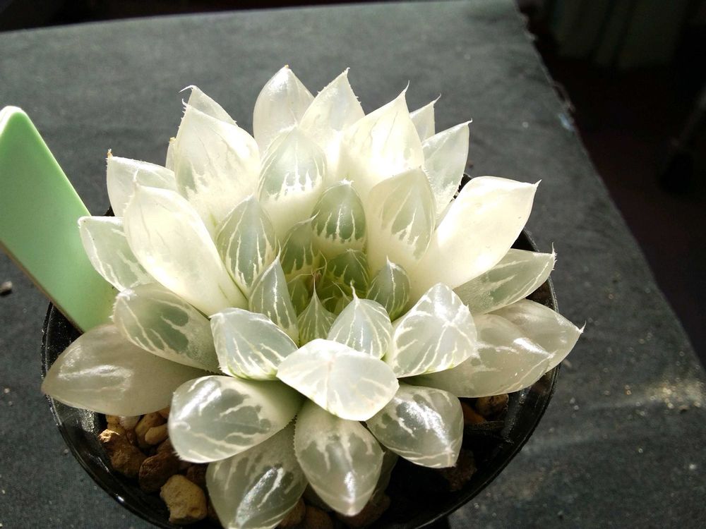 交配した中からたまたま出てきた個体ですがこんだけ白いとお化けになる可能性もあってその場合は致死的なのでどんなもんかと思ってましたが葉の裏に緑がしっかりと入っているので意外と丈夫、という塩梅です。真っ白のハオをオクなどに出している人もいますがよくよく見て買わないと怖いよってお話です