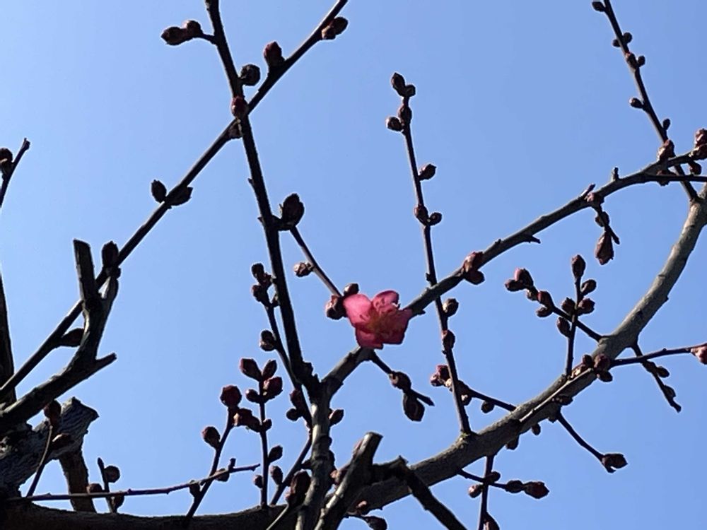 ②紅梅の一輪は開花しているのを見上げてズームして、やっと撮れた一枚です💕