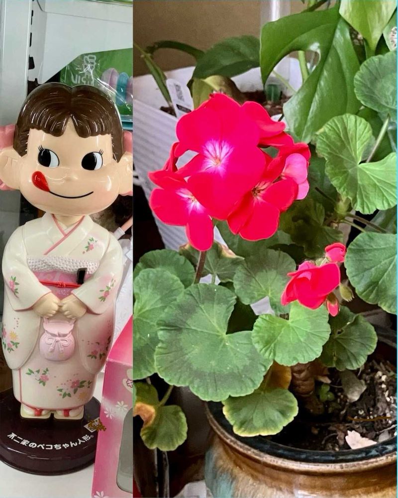 ゼラニウムの花が咲いてきたのでペコちゃんとコラージュして見ました😁